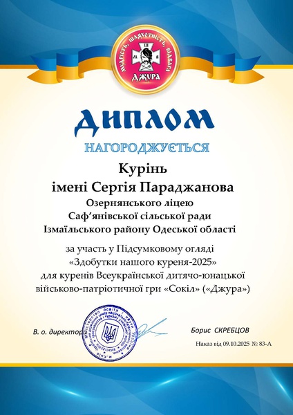 На виконання п. 277 Плану всеукраїнських і міжнародних організаційно-масових заходів з дітьми та учнівською молоддю на 2025 рік (за основними напрямами позашкільної освіти, затвердженого наказом Міністерства освіти і науки України від 21.11.2024 р. № 1641 Український державний центр національно-патріотичного виховання, краєзнавства і туризму учнівської молоді з 22 вересня по 05 жовтня 2025 року проводив Підсумковий огляд «Здобутки нашого куреня» для зареєстрованих куренів Всеукраїнської дитячо-юнацької військово-патріотичної гри «Сокіл» («Джура»).